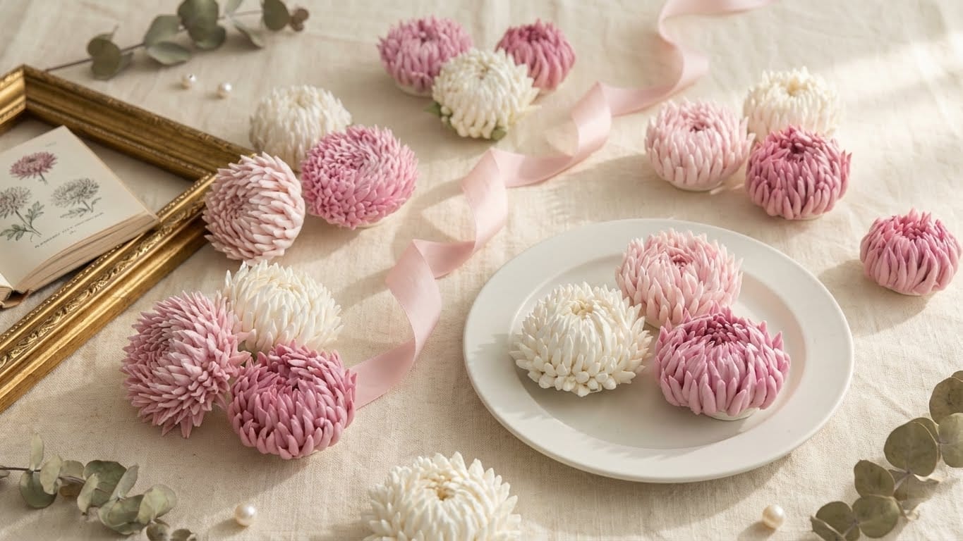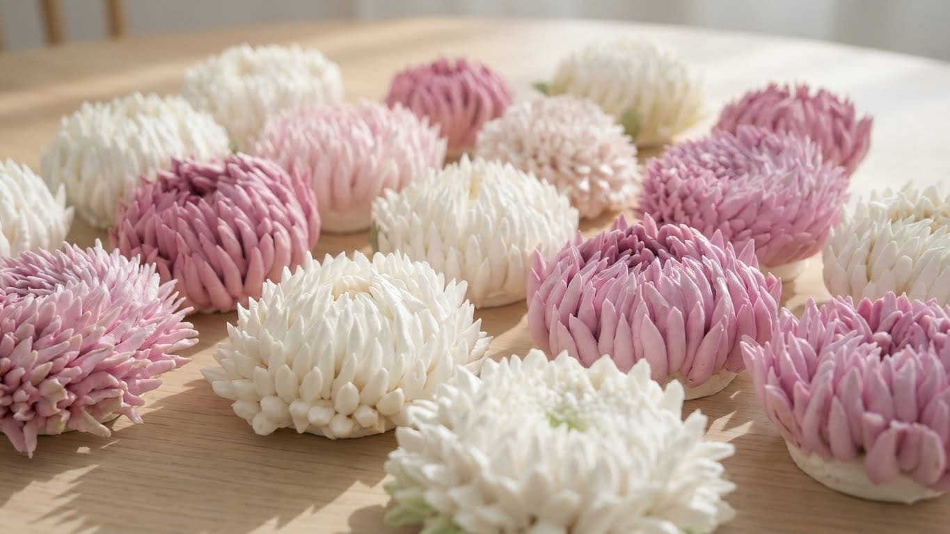 Un cours paisible et détaillé pour apprendre à façonner six variétés de chrysanthèmes délicats, en maîtrisant les gestes, les volumes et les couleurs qui donnent vie à vos bouquets en guimauve.